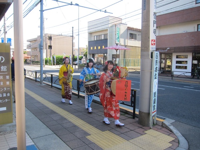 当日は早稲田大学のちんどん研究会の3人が宣伝のため通りを練り歩いてくれました。